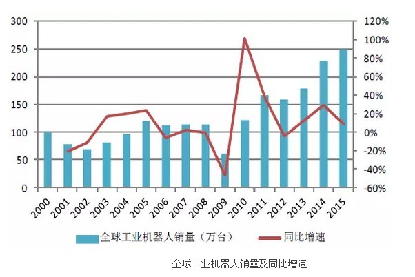 ?? 根據國際機器人聯合會IFR的統計,2015年,全球工業機器人總銷售量達到248000臺,同比增長15%,2002-2008年,全球工業機器人年復合增長率為8.6%,2009-2015年全球工業機器人年復合增長率為23.5%,是過去6年的2.7倍,近幾年全球工業機器人增速明顯加快。?